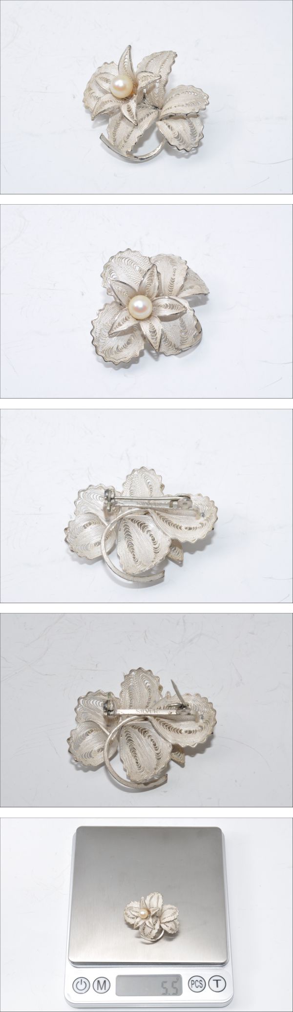 【SILVER刻印】 銀製 ヴィンテージ ブローチ パール 秋田銀細工 平戸細工調 昭和レトロ 和装小物 伝統工芸 5.5g 【No.113】
